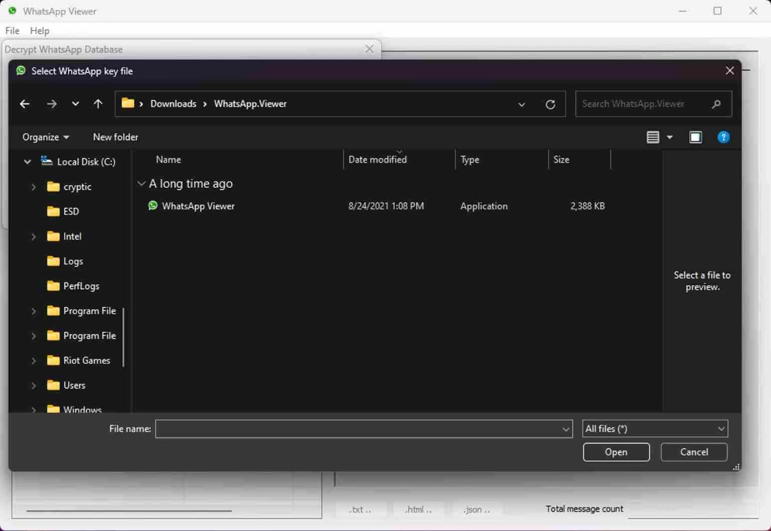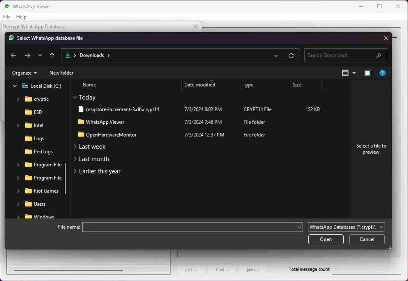 WhatsApp Viewer هو أفضل برنامج لتصدير رسائل واتساب إلى سطح المكتب دون الحاجة إلى اتصال بالإنترنت. يتيح لك التطبيق عرض المحادثات عبر تنزيل ملف Android msgstore.db، ويدعم إصدارات crypt 5 وcrypt 7 وcrypt 8 وcrypt 12. يمكنك الاحتفاظ بنسخة احتياطية من رسائل واتساب والبحث فيها دون الحاجة إلى تثبيت مكتبة crypt.